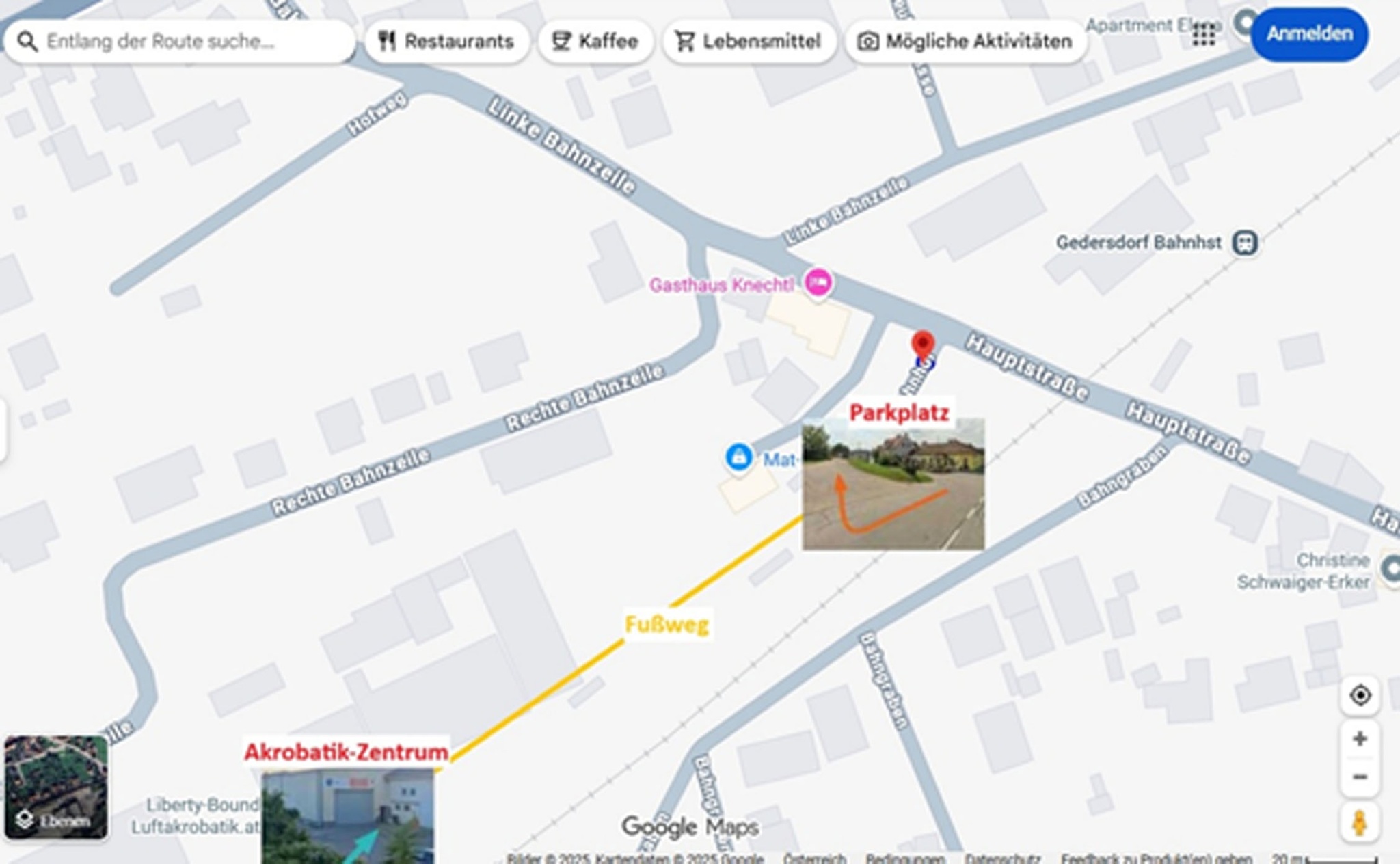 Parken: Am Schotterparkplatz des Bahnhofs Gedersdorf möglich – Fußweg den Schienen entlang Richtung Akrobatik-Zentrum – siehe Abbildung